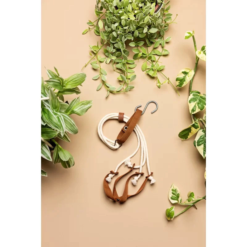 Nossa alça artesanal envolve o cachepô, elevando suas plantas sem a necessidade de furar a peça. Feita com um cinto de tecido e cordão de algodão, nossa alça proporciona um toque único de elegância e charme ao seu espaço verde.