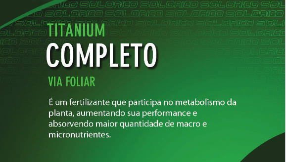 Titanium Completo (N 5%, P2O5 8%, K2O5 5%, Ca 0,6%, Mg 0,04%, B 0,04%, Cu 0,05%, Mn 0,5%, Zn 1%, Aminoácido 14%) é um fertilizante que participa no metabolismo da planta, aumentando sua performance e absorvendo maior quantidade de macro e micronutrientes.
